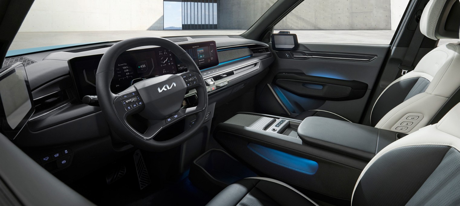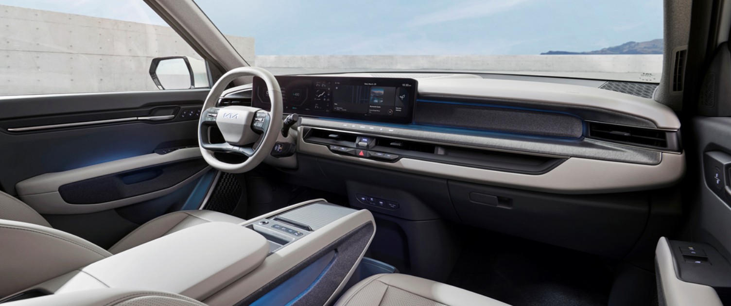 EV9은 12.3인치의 디지털 클러스터 및 인포테인먼트 시스템 디스플레이, 5인치 공조 파노라믹 와이드 디스플레이를 적용 세 개의 디스플레이가 매끄럽게 연결된 파노라믹 와이드 디스플레이를 통해 운전자에게 필요한 정보를 효율적으로 전달할 수 있다