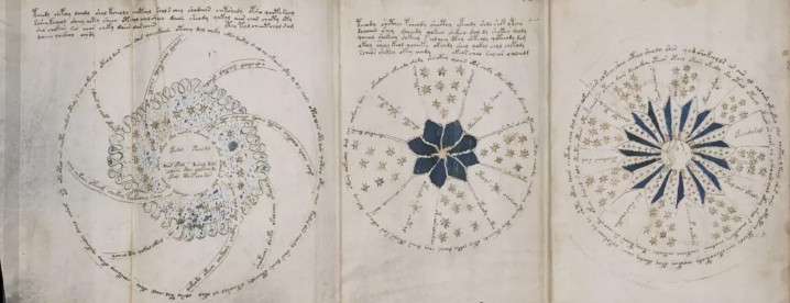 보이니치 원고에는 별과 행성과 같은 천체를 복잡한 세부 사항으로 묘사하는 많은 천문 차트가 포함되어 있습니다. 이러한 차트 중 가장 눈에 띄는 것 중 하나는 보이니치 천문도(Voynich Astronomical Chart)로 알려져 있으며 학자와 연구자들 사이에서 많은 추측과 논쟁의 대상이 되어 왔습니다.